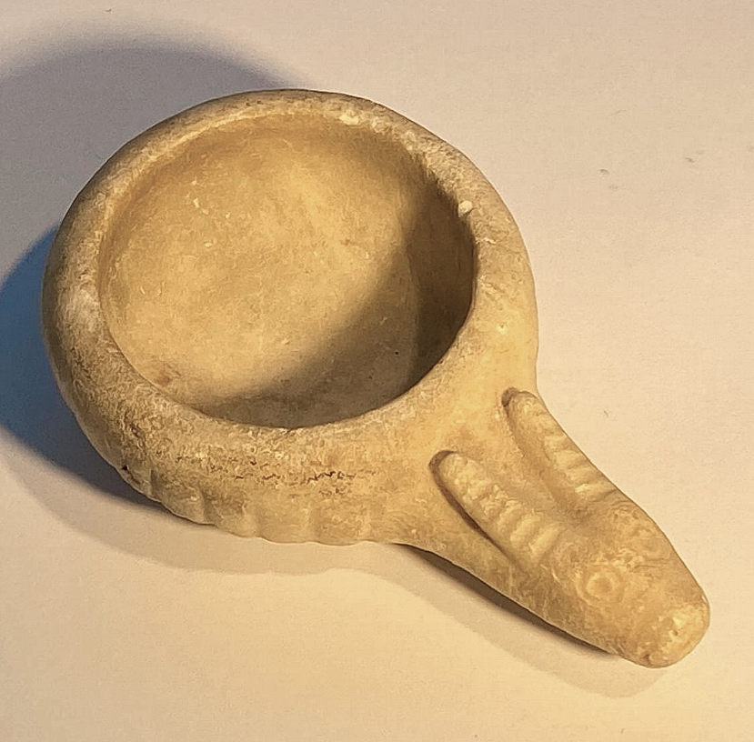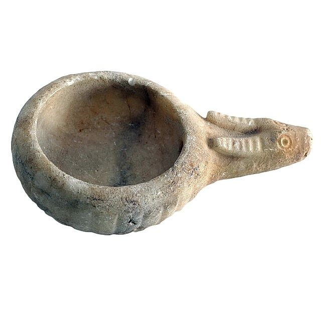קערית קוסמטיקה (תמרוקים) מאבן, עם ראש אייל [זואומורפי]. תקופת הברונזה המאוחרת