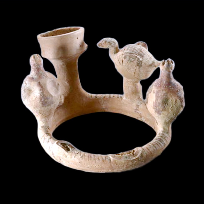 קרנוס עליו 2 רימונים וציפור (הציפור השניה חסרה), בסיס ראש בע”ח (שלא שרד) ומיכל מילוי. תל סאסא (הגליל המערבי). תקופת הברזל 1-2 (מאות 11-9 לפנה”ס)