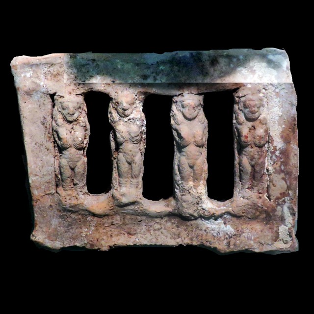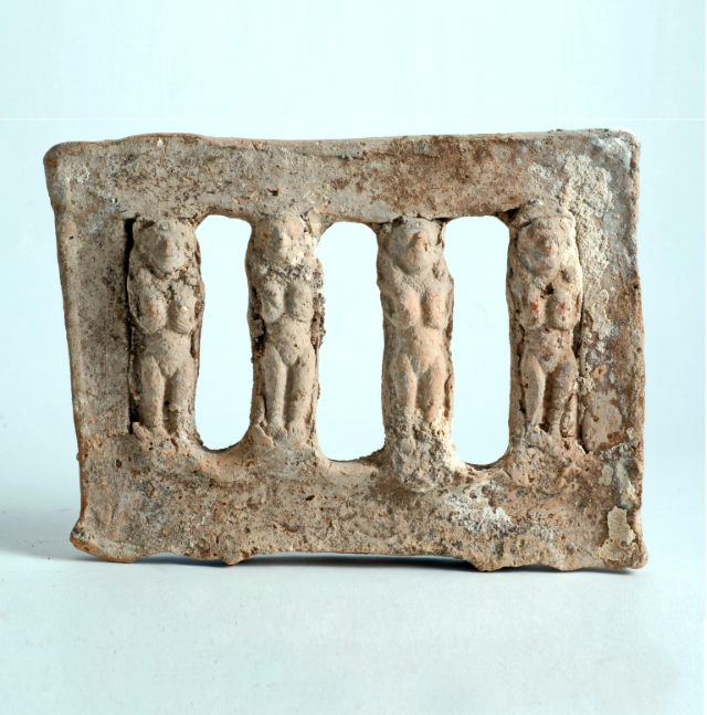 קרניז של דגם מקדש עם 4 דמויות וחלונות. תקופת הברזל 2 (מאות 9-10 לפנה"ס)