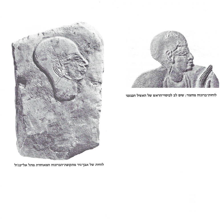 ראש כנעני על גבי לוחית (Slab) אבן (Stone) מתל עג’ול (רצועת עזה) בהשוואה ללוחית (Slab) עם דמות כנענית מחצור. תקופת הברונזה (Bronze) המאוחרת