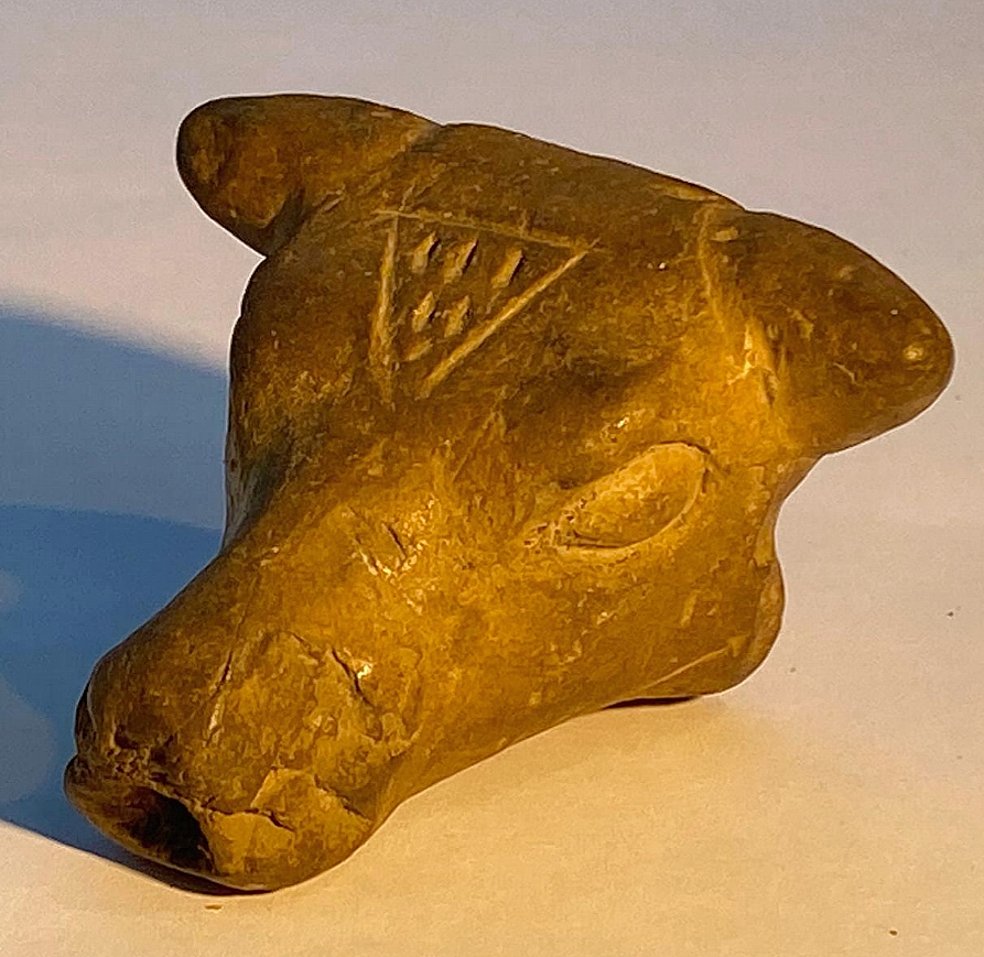 ראש פר משנהב (?), מעוטר באמצע המצח במשולב עם נקודות. תקופת הברונזה הקדומה 3