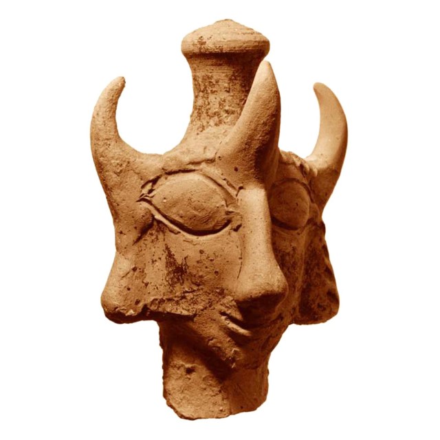 ראש צלמית (Figurine) אל, עם 3 קרניים. אדומי. קטמית (חורבת קיטמית, בסיס נבטים בנגב, כ-11 ק”מ דרומית לתל ערד). מימי ההתיישבות האדומית בנגב לאחר חורבן ממלכת יהודה. תקופת הברזל 2ב