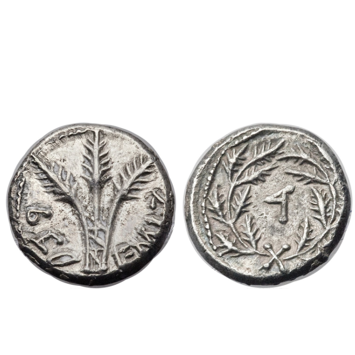 רבע שקל כסף מתקופת המרד נגד הרומאים מעוטר ב3 ענפי עץ דקל. שנה רביעית למרד הגדול (69 לספירה). התקופה הרומית הקדומה