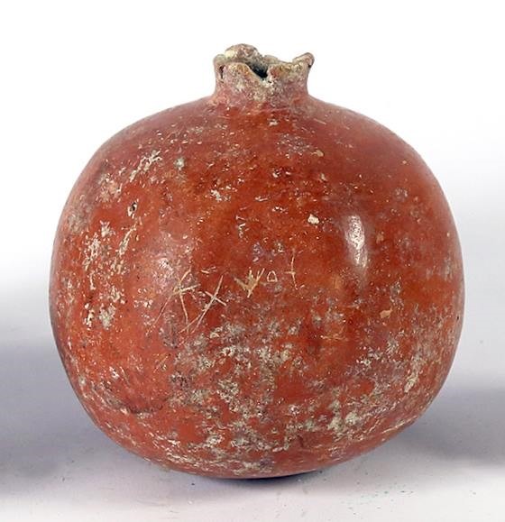 רימון מחופה אדום, עם כתובת “לעשתא” (לעשתר?). תקופת הברזל 2