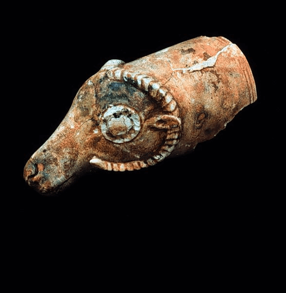 ריתון ראש אייל מפאיינס, בצורה הדומה לריתון שנתגלה בתל אבו הואם (חיפה). נמשה מהים מספינה שנטרפה ליד אולובורן (Uluburun) בדרום תורכיה. תקופת הברונזה המאוחרת