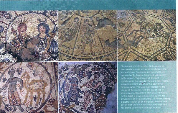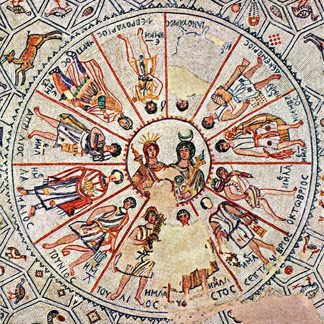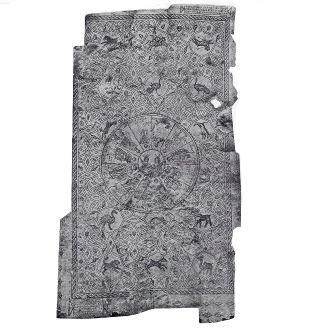 רצפת פסיפס מנזר הגבירה מרים עם גלגל המזלות, אל השמש הליוס ואלת הירח סלינה, תל אצטבה (צמוד לתל בית שאן). התקופה הביזנטית