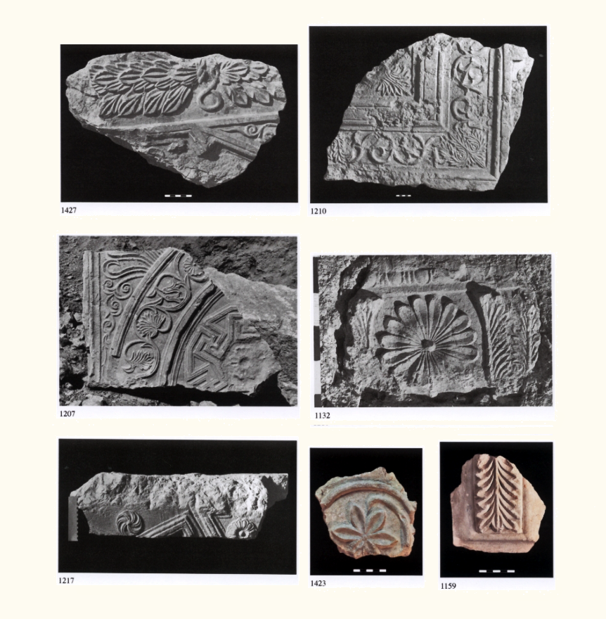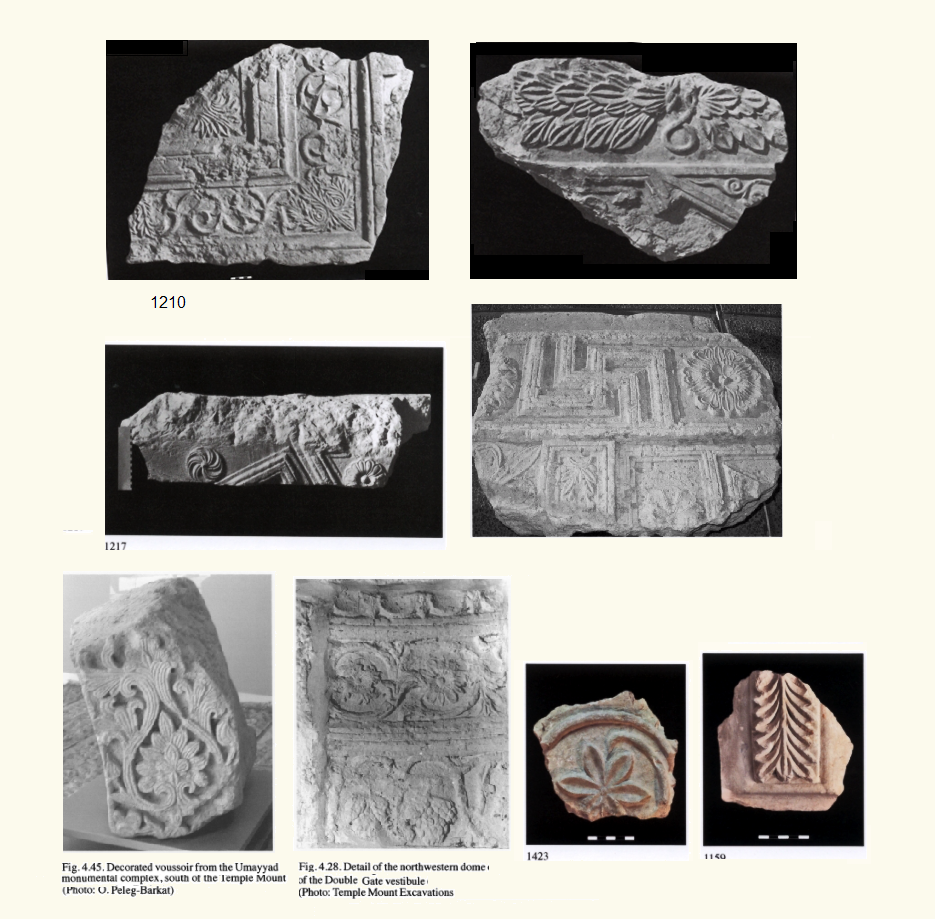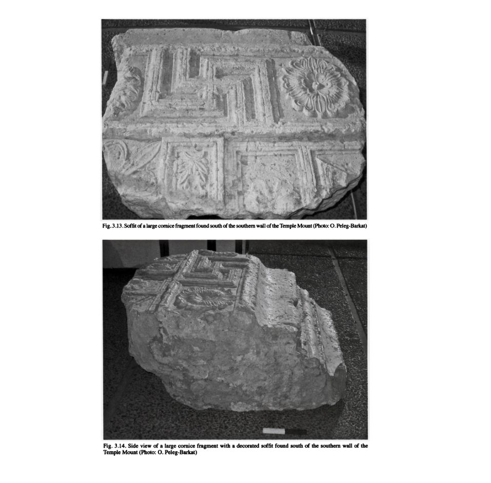 שברי אבני בנייה מעוטרות מקומפלקס בית המקדש השני שנתגלו בחפירות מדרום להר הבית (מתוך עבודת אורית פלג). תקופת הבית השני. התקופה הרומית הקדומה