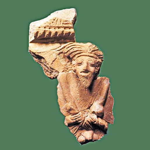 שבר כן פולחני עם דמות גבר מזוקן המחזיק קורבן של בעל חיים בשתי ידיו. עיר דוד שטח G (יגאל שילה) ירושלים. סביבות שנת 1000 לפנה"ס.תקופת הברזל הקדומה