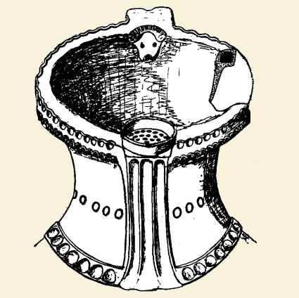 שבר עליון של קנקן (Jar) ובו “טבעת” (צינורית) וראש בעל חיים בסגנון “כלי פעלול”. עם מסננת (Strainer). תל גזר. (כנראה) תקופת הברזל 1