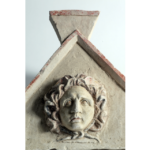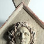 שבר (קדמי) של מכסה סרקופג מעוטר בתבליט ראשה של מדוזה המיתולוגית (“המגינה”). התקופה הרומית המאוחרת
