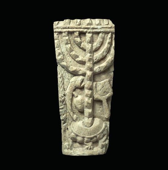 שיבוץ עצם עם גילוף מנורת 7 קנים, מחתה, שופר, אתרוג ולולב על בסיס עגול. עמק בית שאן. התקופה הביזנטית