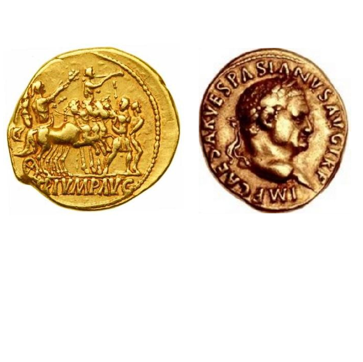 שמעון בר גיורא מראשי המרד היהודי ברומאים בירושלים, מובל כשבוי ערום בתהלוכת הניצחון שהתקיימה ברומא לציון דיכוי המרד הגדול ביהודה (שנת 70 לספירה). מטבע זהב (Gold) מסדרת “יהודה השבויה” שהטביע הקיסר אספסינוס ברומא. התקופה הרומית הקדומה