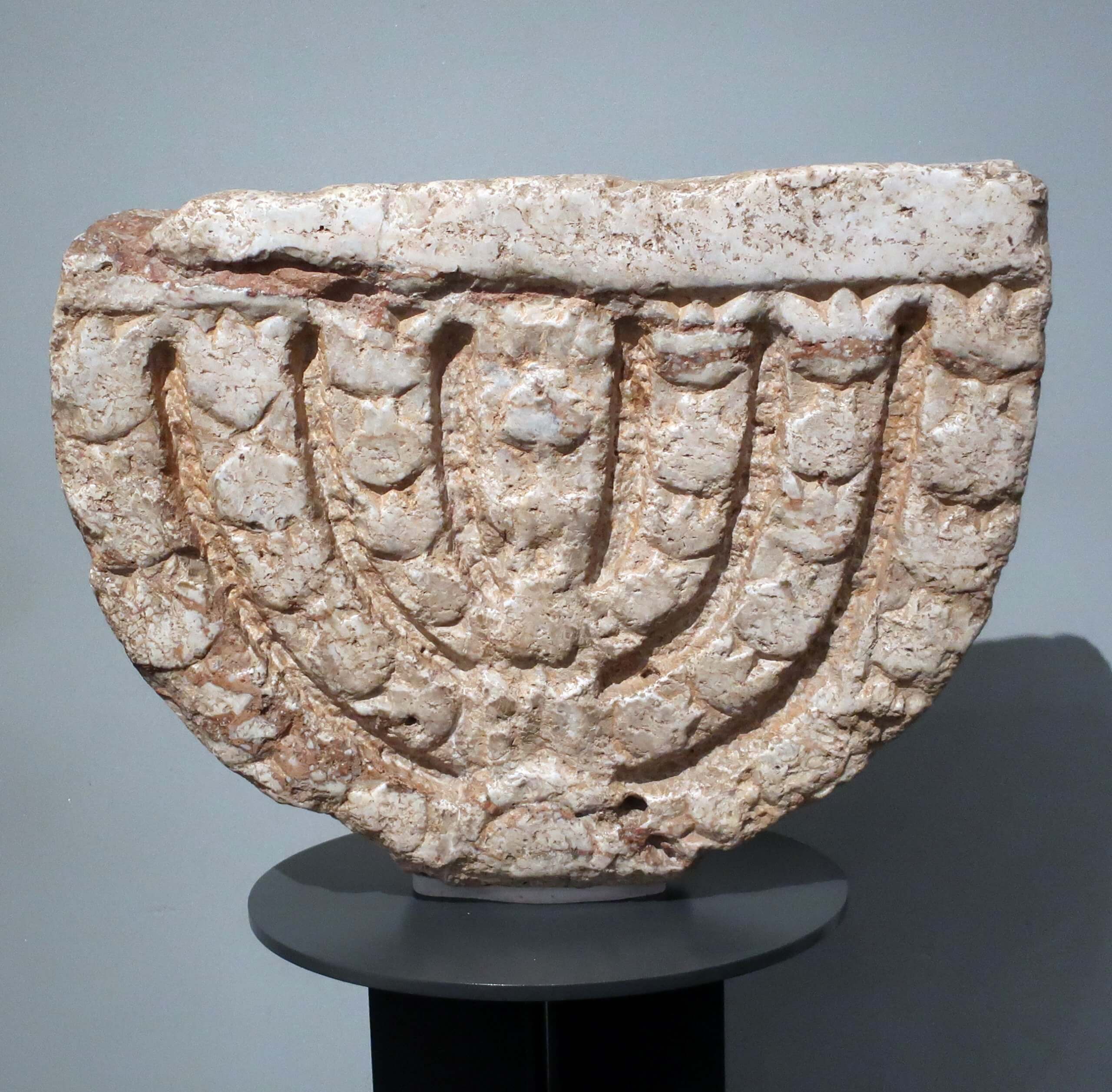 תבליט מנורת שבעת הקנים מאבן מבית הכנסת בחמת טבריה. מעוטרת במוטיבי “כפתור ופרח”. בחלקה העליון שקערוריות לשמן ולהדלקה. המאה ה-3 או ה-4 לספירה