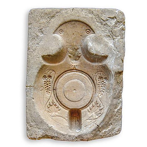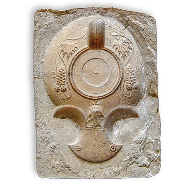 תבנית אבן ליציקת נר שמן מפואר מעוטר בענבים ועלי גן ואמפורה. התגלה בשיחין Shikhin (הגליל התחתון ליד ציפורי). שלהי המאה הראשונה לספירה.