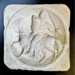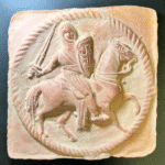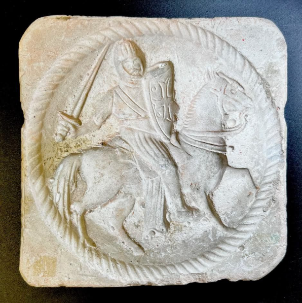 תבנית יציקה בה נראה פרש עם חרב ומגן רכוב על גבי סוס. התקופה הצלבנית.