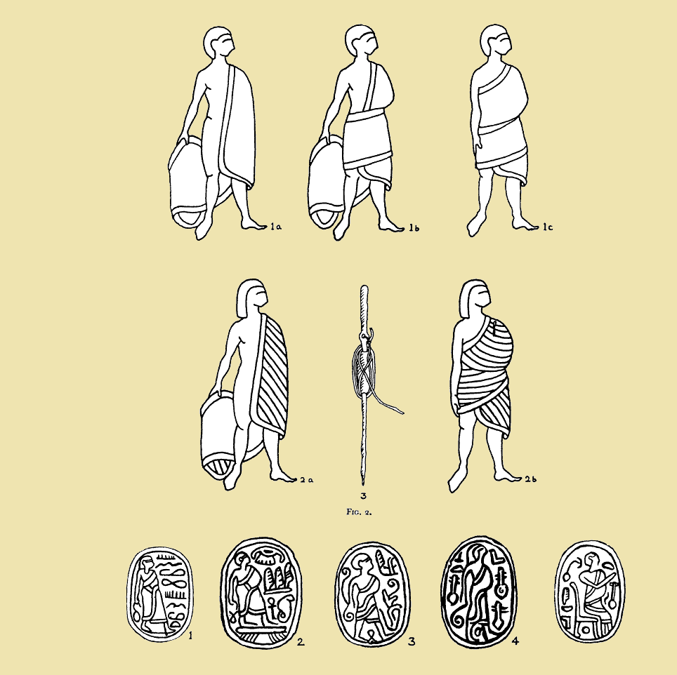 תלבושת הגברים בתקופת הברונזה (Bronze) התיכונה 2 על פי תיאוריהם על גבי חרפושיות היקסוסיות מארץ ישראל. מתוך מאמר Olga Tufnell. תקופת הברונזה (Bronze) התיכונה 2