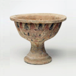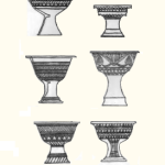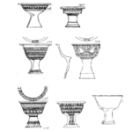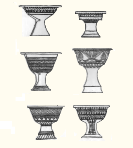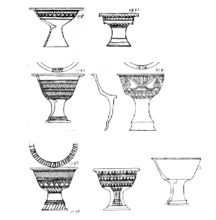 קובעת מעוטרת (בגווני אדום-שחור) ותרשים קובעות מעוטרות אחרות מתל פרעה דרום (שרוחן). תקופת הברזל 1