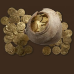 108 מטבעות זהב (Gold) (Gold), מהם 93 דינרי זהב (Gold) (Gold) ו-15 רבעי דינרים כולם אסלאמיים, מן 909 לספירה עד 1171, התקופה הפאטמית