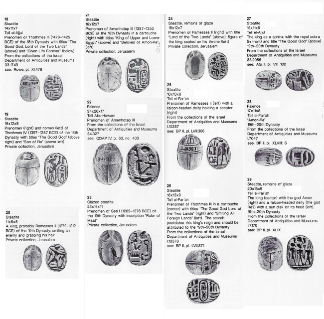 12 חרפושיות מרביתן עם כרטוש מלכותי מתקופת השושלת ה 18 (בהם תחותמס השלישי והרביעי, אמנחותפ השלישי) והשושלת ה-19 (בהם סתי הראשון, רעמסס השני) מתל אל עג’ול, תל פרעה דרום, תל אבו הואם (חיפה) ומאוספים פרטיים. תקופת הברונזה (Bronze) המאוחרת