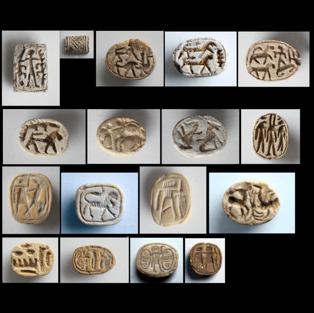 16 חותמות וחרפושיות עם בעלי חיים מאבן, סטייאטיט ועצם. תקופת הברזל. יתכן ומקצת החותמות הוא משלהי תקופת הברונזה המאוחרת.