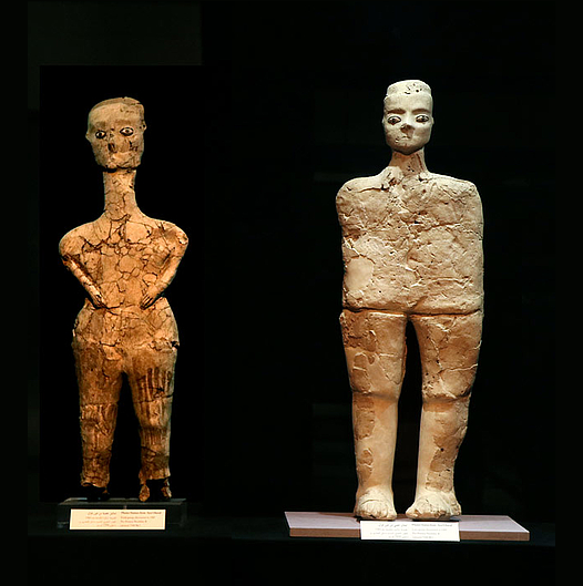 2 פסלים גדולים (כ-90 ס"מ כל אחד), העשויים מחמר ומטיח-גירי (plaster). בראשי הדמויות שובצו צדפים על מנת לדמות את העיניים. עין ע'זאל (לגדות נהר היבוק = נחל זרקא, סמוך לרבת עמון, ירדן). התקופה הניאוליתית הקדם קרמית ב' (7250-6500 לפנה"ס).