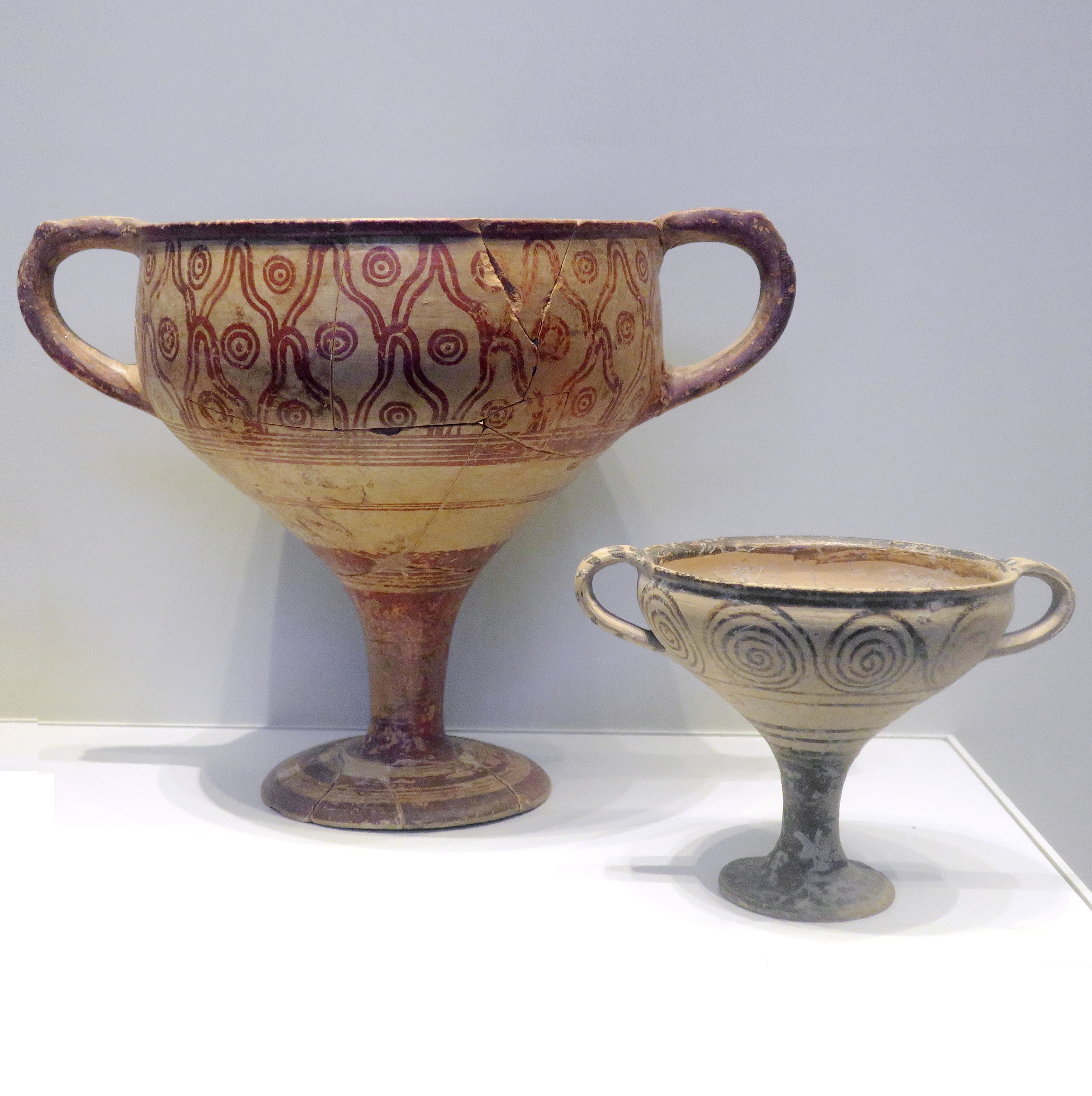 2 קיליקסים (גביעים) מיקניים, האחד (עם ספירלות) מירושלים (כנראה מנחלת אחים) והאחר (הגדול יותר) מטיפוס מינואי (יוון), ממערת קבורה בגן הבהאי בצפון עכו. מוזיאון ישראל. יבוא קדום מתקופת הברונזה המאוחרת.