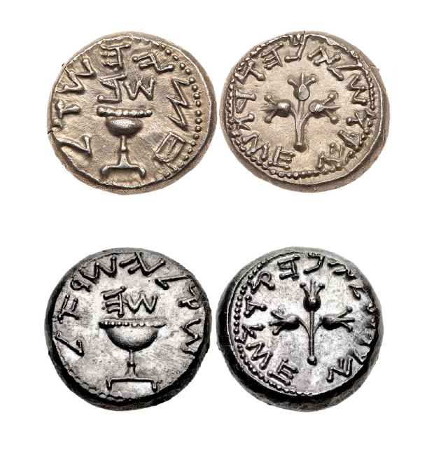 2 שקלי כסף מתקופת המרד הגדול ברומאים, האחד משנה "ב" (שנת 67 לספירה) והשני משנה "ה" (שנת 70). בחודש הרביעי של שנה "ה" נפלה ירושלים. התקופה הרומית הקדומה
