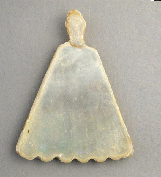 2 תכשיטי צדף (כ”א מצולם משני צדדיו). ככל הנראה נטיפות. נטיפות מצדף ללא חירור התגלו בנחל פטיש (גילת) מהתקופה הכלקוליתית המאוחרת