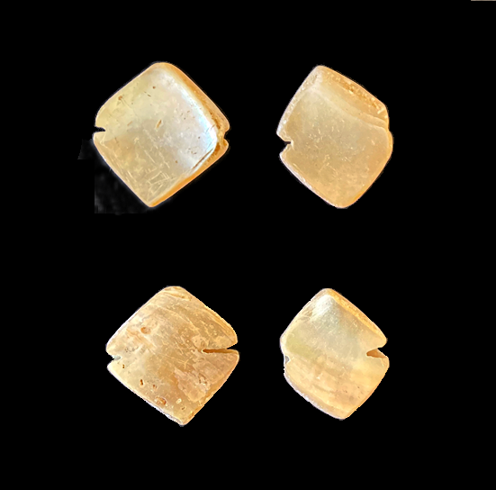 2 תכשיטי צדף (כ"א משני צדדיו). ככל הנראה נטיפות. נטיפות מצדף התגלו בנחל פטיש (גילת) מהתקופה הכלקוליתית המאוחרת