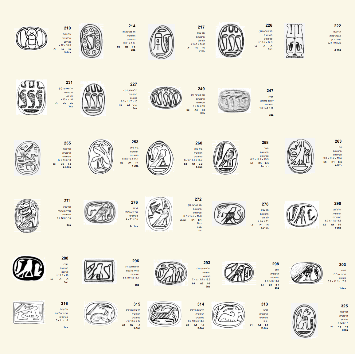 23 חרפושיות מעוטרות בבעלי-חיים (חיפושית, קוברה, ברווז, חסידה, בז, ציפור, איילה, כלב) מאתרים ארכיאולוגים מתקופת הברונזה (Bronze) המאוחרת (קב' II)
