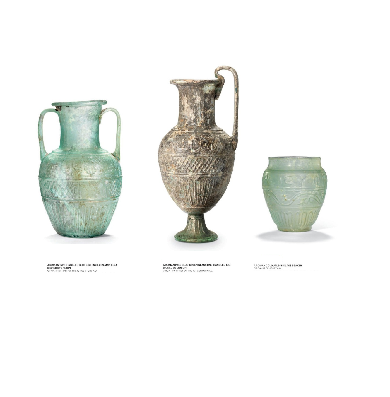 3 כלי זכוכית מבית מלאכתו של אניון (חנן?), אומן זכוכית צידוני (יהודי?). המאה הראשונה לספירה. התקופה הרומית הקדומה