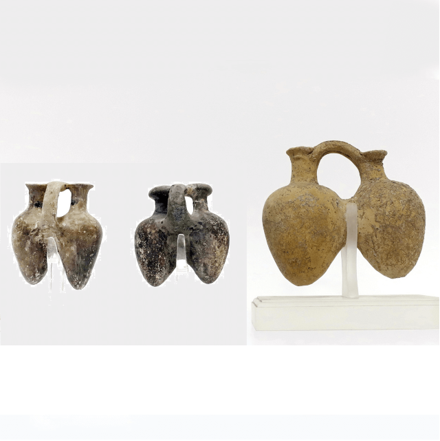 3 פכיות “כלי תאומים”, בצורת מיני-קנקנים מחוברים בידית משותפת, תקופת הברונזה התיכונה 2