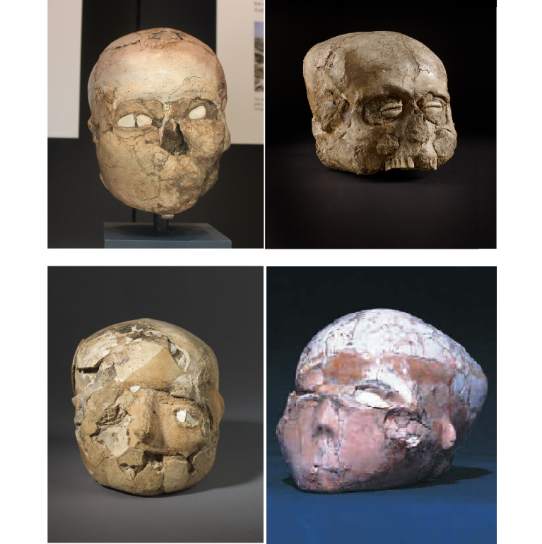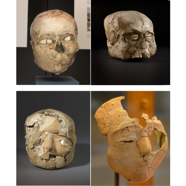 4 גולגלות מכוירות שנמרחו בטיח-גיר-גבס (plaster) כאשר בחלל העיניים הושמו צדפות. תל יריחו. התקופה הניאוליתית קדם קרמית ב’.