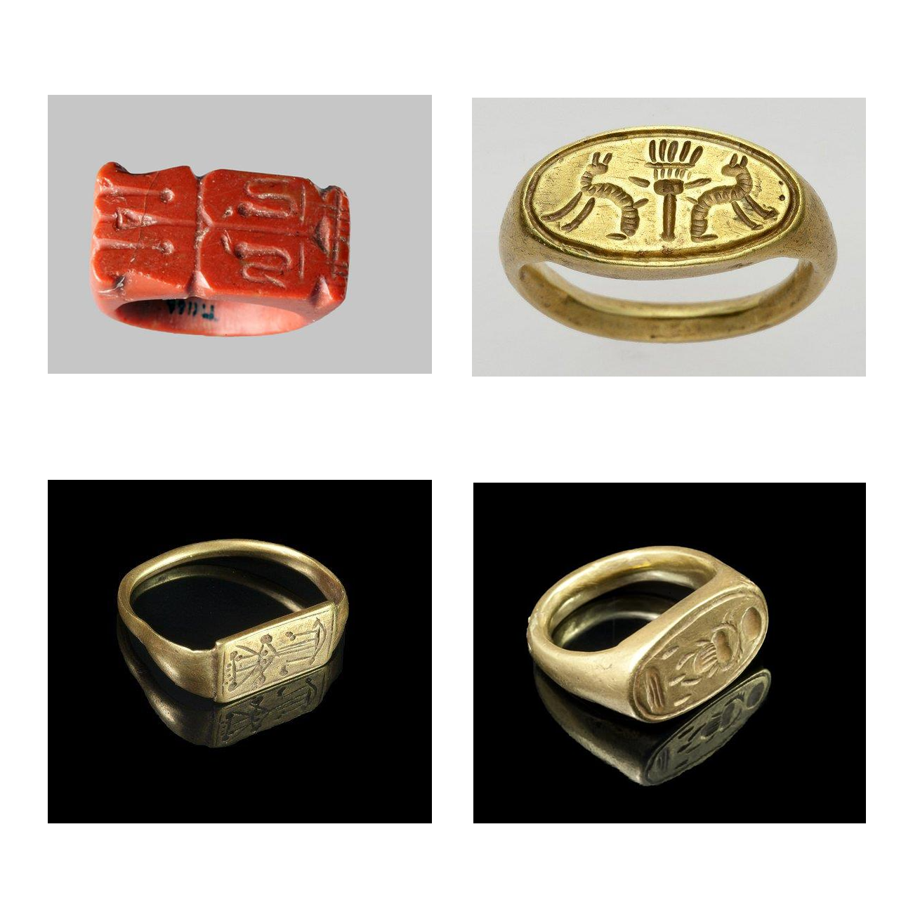 4 טבעות מצריות (3 מזהב ואחת מאבן ג’ספר אדום). תל אל עג’ול. תקופת הברונזה המאוחרת