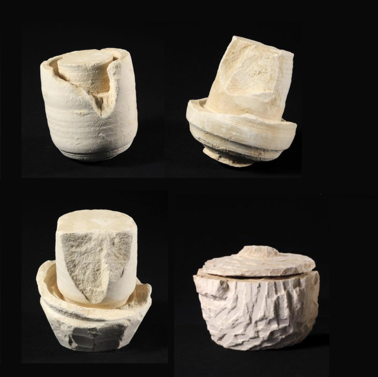 4 קערות אבן בתהליכי ייצור, נפגמו במהלך העבודה, מחצבת “מפעל” כלי אבן, הר הצופים (מזרח), המאה הראשונה לספירה, התקופה הרומית