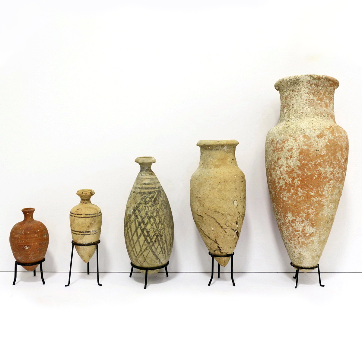 5 Assyrian type bottles. (the second on the left is from Amman Trans Jordan). Iron Age 2C.