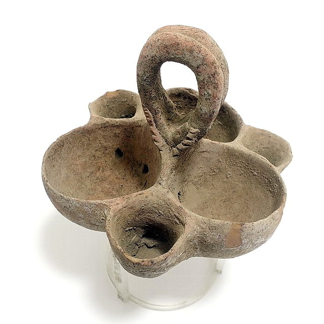 6 bowls connected to each other, with basket handle, decorated with a relief of an ibex. The Early Bronze age 1