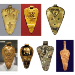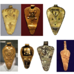 7 תליוני זהב (Gold) של האלה עשתורת בדמות ראש האלה חתחור, תל אל עג’ול (3 העליונים), אולובורון (מספינה טרופה שנמצאה בדרום תורכיה), לבנון. שלהי תקופת הברונזה (Bronze) התיכונה – ברונזה (Bronze) מאוחרת.