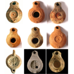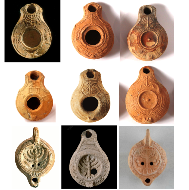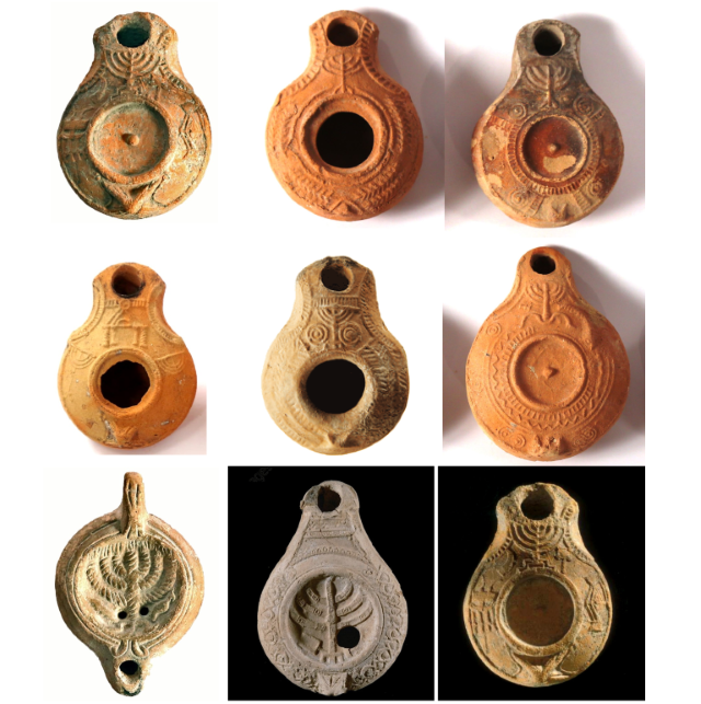 9 נרות שמן עם מנורה (Candelabrum). המאות הרביעית והחמישית לספירה. התקופה הביזנטית מאוספים פרטיים שונים (ביניהם נר שמן שומרוני, נר שמן מאלכסנדריה ואח').