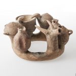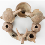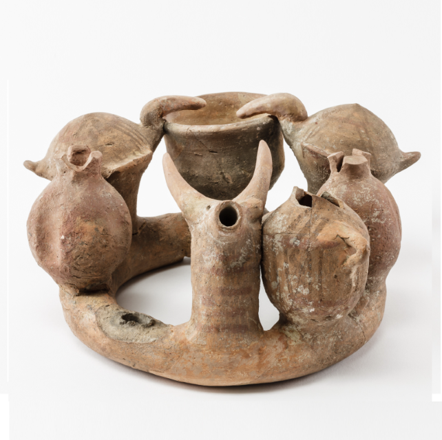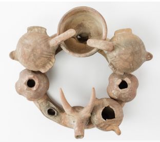 קרנוס עליו 2 רימונים, 2 ציפורים הנראות שותות ממיכל המילוי, 2 כדים (אחד לא שרד) וראש בע"ח (אייל?). מגידו. תקופת הברזל 1 (מאות 12-10 לפנה"ס).