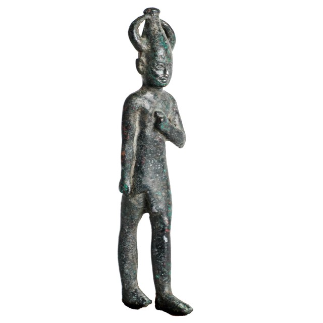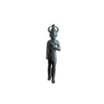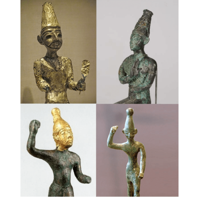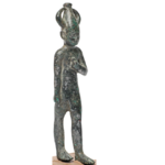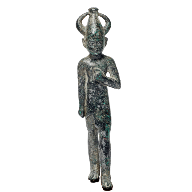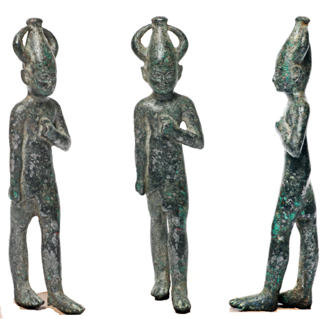 A large bronze figurine of the Canaanite god Baal (identified with the god of storm and mutual fertility), in a walking position. On his head is a pointed hat (Egyptian style) with 2 horns. The Late Bronze Age