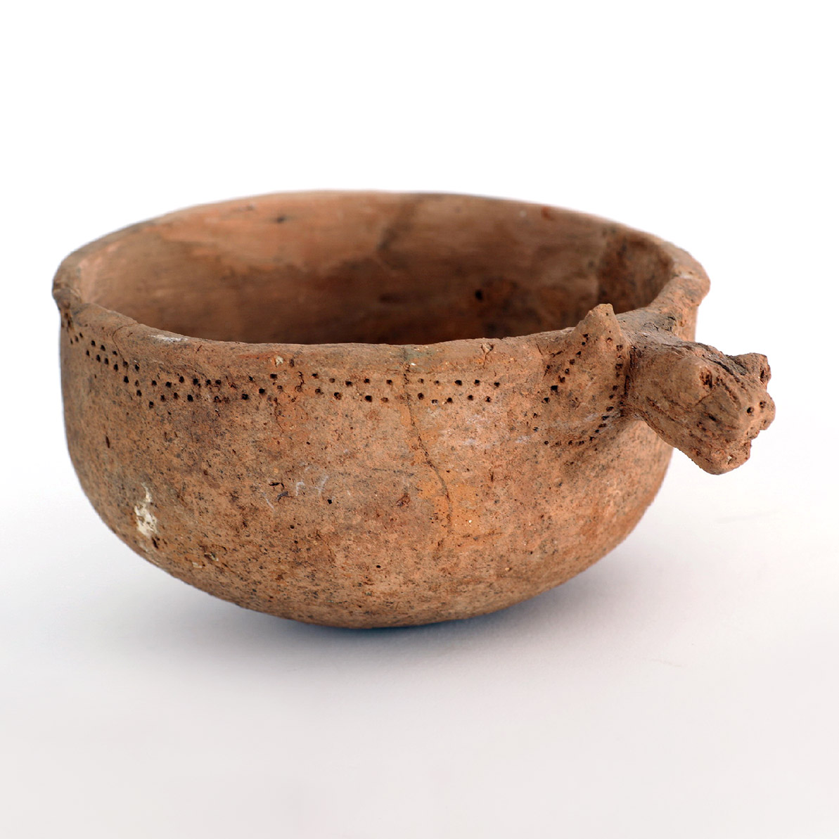 A lion’s head-shaped small bowl, with a handle, perforated around the rim of the vessel. Iron Age I.