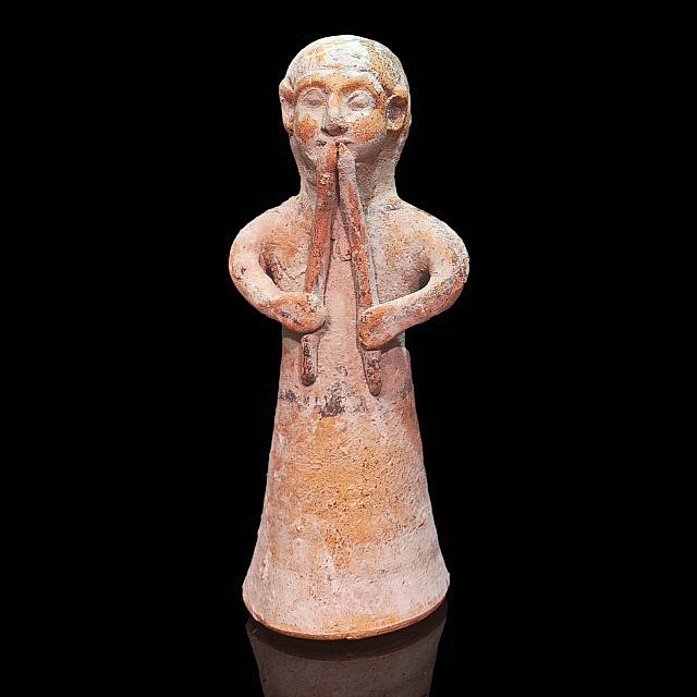צלמית גבר המנגן ב-2 חלילים. טיפוס פיניקי (צפון א"י). תקופת הברזל 2 (מאות 6-8 לפנה"ס)