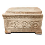 A small limestone ossuary decorated with 7 columns and ashlars on one side and 2 rosettes on the other side. First century AD.