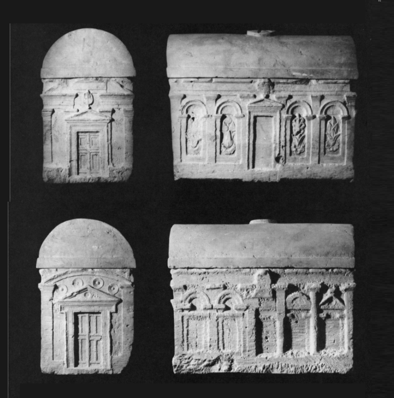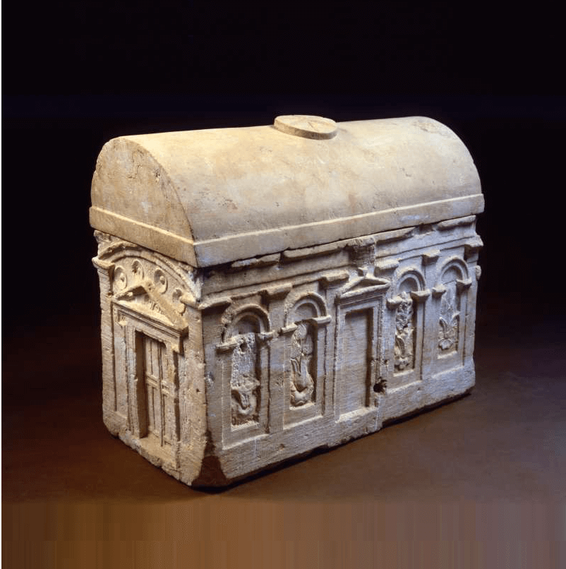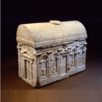 A splendid ossuary, decorated all around with 2 gates and long windows, in the shape of a house. Resemble Nabatian rock-tomb facades of Petra. Found in Jerusalem. The carving of the ossuary was not fully completed, especially on its back side. The early Roman period