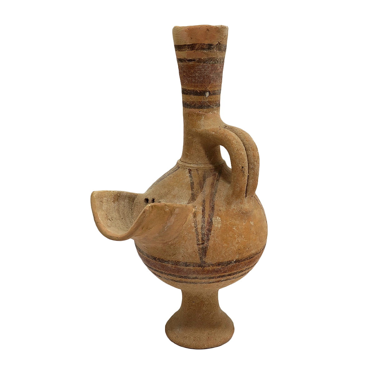 A spouted “beer jug”, with an elongated neck. Phoenician pottery. Red and black decoration (Bi-Chrome). North Samaria region (Dothan?). Iron Age I