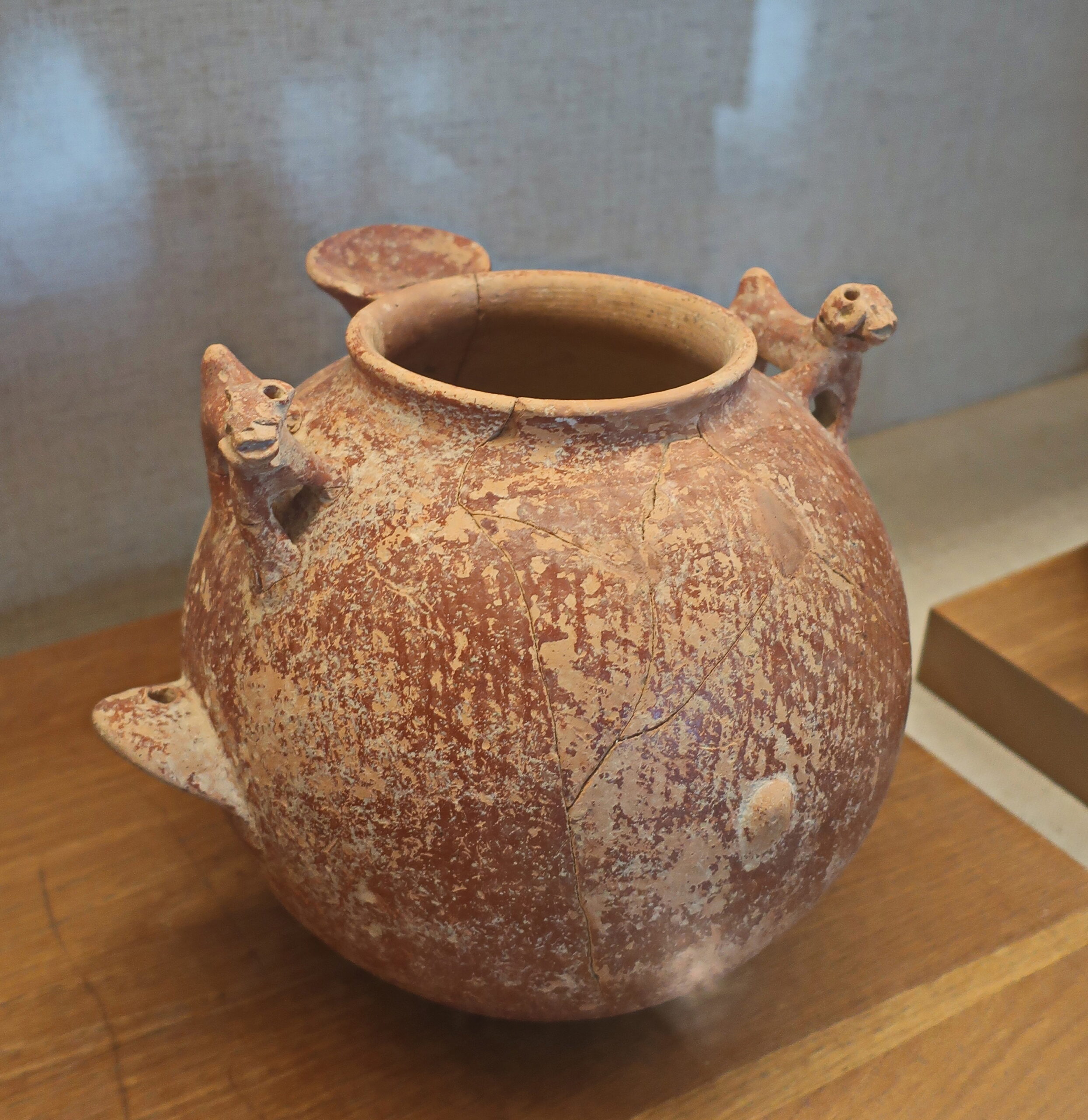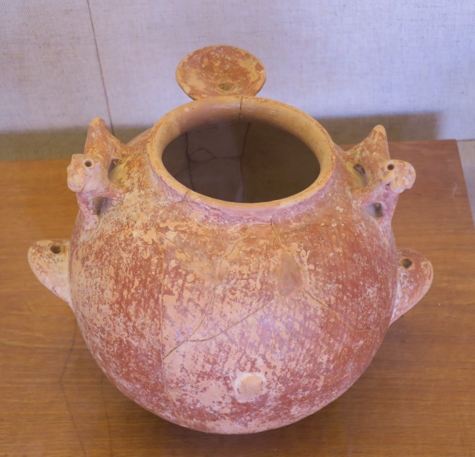 A spouted jar with ledge-handles, with 2 zoomorphic figurine-handles. Red burnished slip. Tell el Farah (north) workshop style. The Early Bronze Age 1