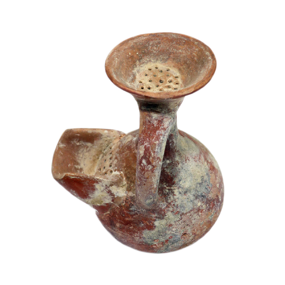 פך-חדק (שבור), מחופה אדום, עם מסננת בפיה ובחדק. מתוקן. תקופת הברזל 2