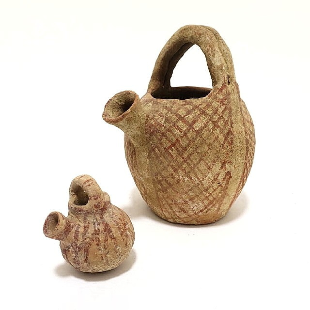 קומקום (קנקן) ומיני קומקום (קנקנית) מעוטרים ברשת, עם חדק וידית סל, ברונזה קדומה 1