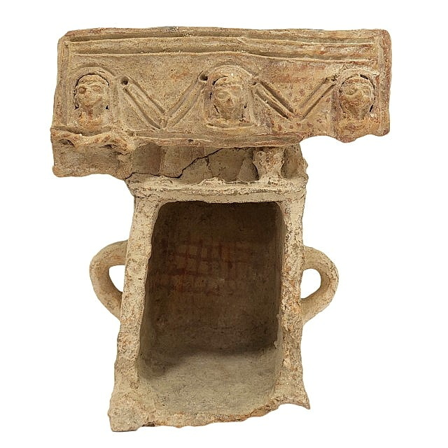 A temple model with 2 handles and 3 head figures at the cornice. Jordan. Iron Age II (9th-10th centuries BC).